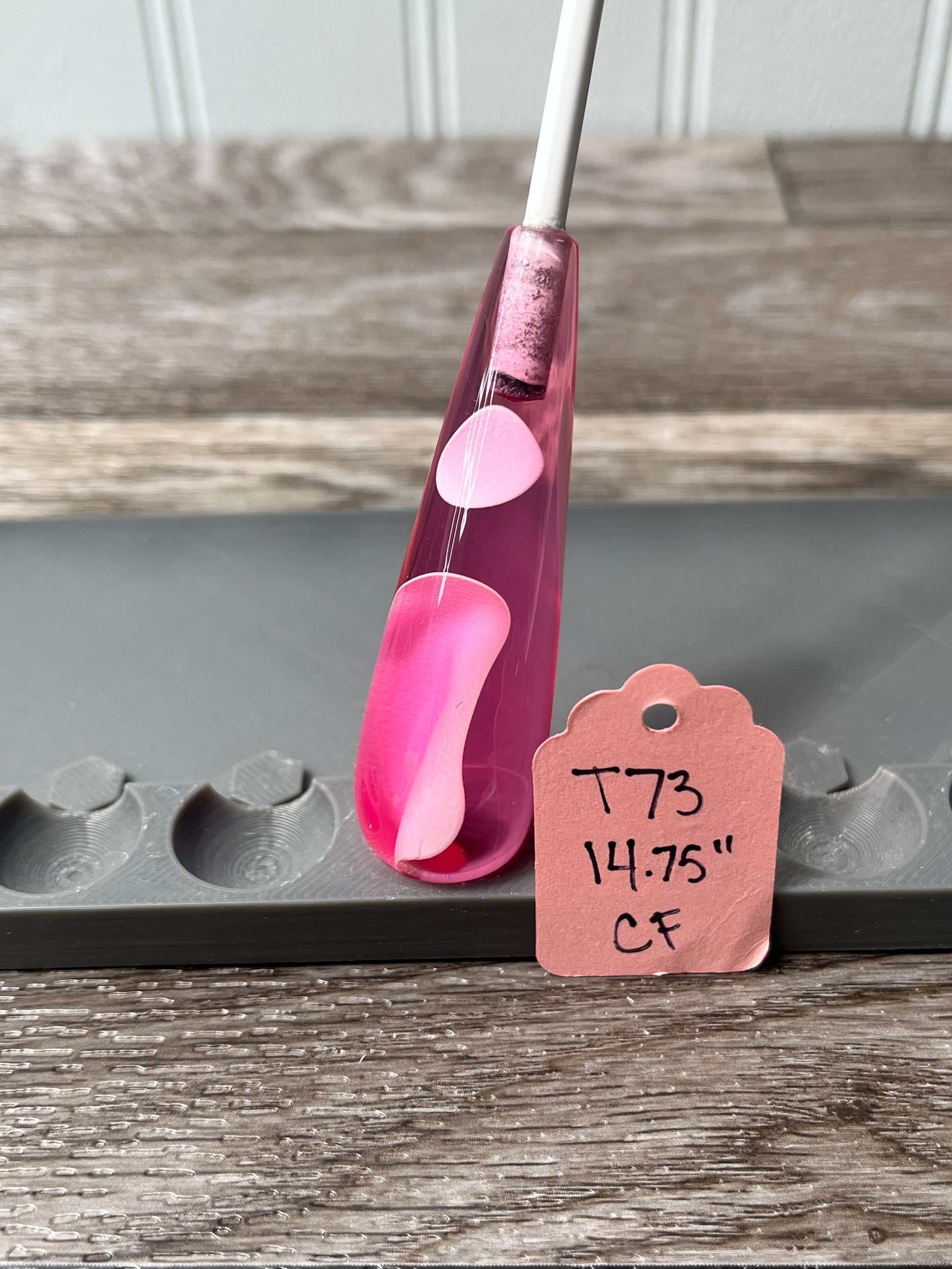 White tags have a fiberglass shaft while Pink Tags are Carbon Fiber